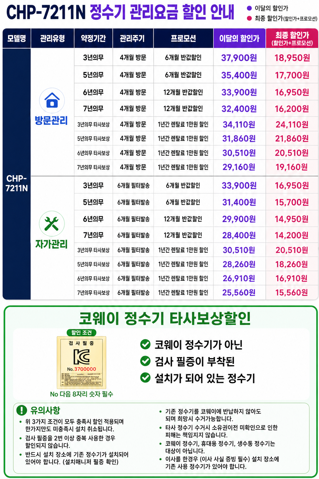 · 제휴카드 : 13,000원 ~ 30,000원 할인 (코웨이 신한카드)